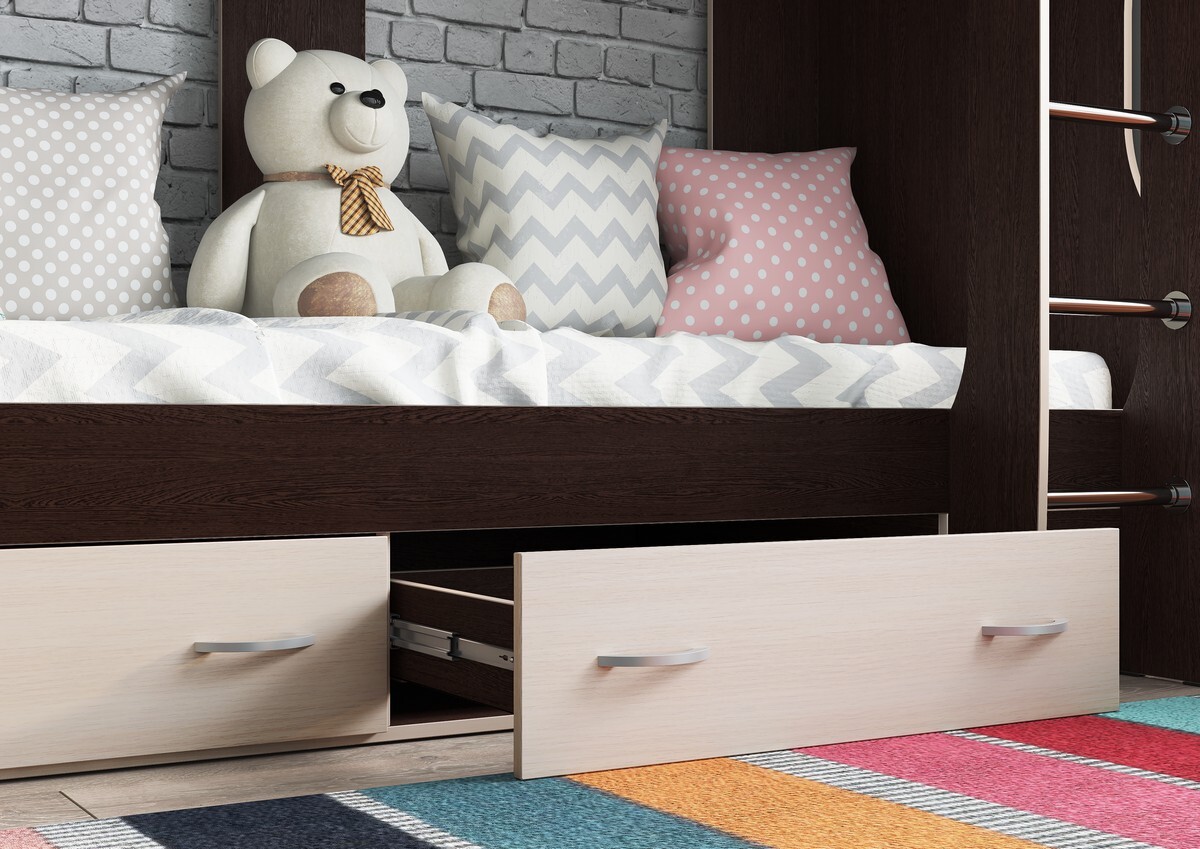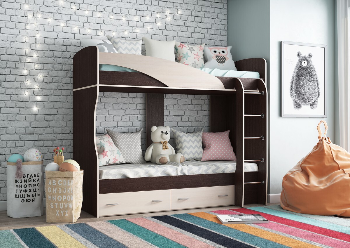 МИЙА Кровать 2х ярусная 800*2000 **Описание:** Эта стильная двухъярусная кровать от производителя СТИЛЬ идеально подойдет для детской комнаты! Благодаря своим размерам (Ширина — 2032 мм, Высота — 1700 мм, Глубина — 1000 мм) она гармонично впишется даже в небольшое пространство. Корпус выполнен из качественного материала — ЛДСП, что обеспечивает долговечность использования мебели. В комплекте идут выдвижные ящики со специальными шариковыми направляющими для удобства эксплуатации. Независимо от того, хотите ли вы использовать эту кровать как спальное место или же вам нужно дополнительное место хранения вещей, эта модель станет отличным выбором!